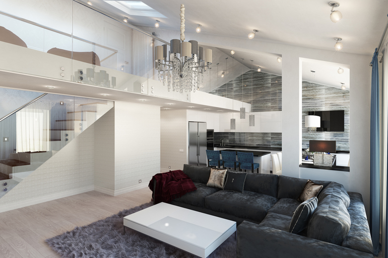 Уникальная квартира, расположенная на последнем этаже малоэтажного жилого дома, изначально имела высокий конёк крыши, что позволило обустроить полноценный мансардный этаж под зоной вспомогательных помещений первого этажа. Благодаря возведенному монолитно-железобетонному перекрытию образовалась дополнительная площадь, где разместилась спальня родителей с гардеробной и санузлом, а также небольшой балкончик. На первом этаже при этом сосредоточились основная общая зона кухни-гостиной, просторная прихожая с гардеробной, ванная, туалет и две детские комнаты.