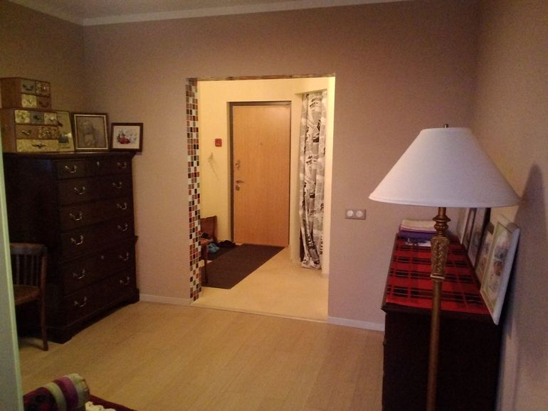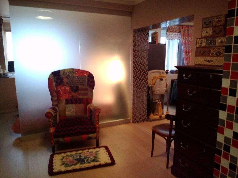 Гостиная разделена матовым стеклом и отделяет спальню. В зоне гостиной пока отсутствует диван, который займет место большого комода, а комод переедет в спальню.