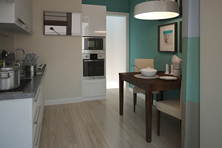 А сколько у вас короб в ширину? У нас точно также он стоит, всю голову уже сломала как бы его обыграть, как мебель расставить( у вас были еще какие-нибудь идеи, может фото подобных кухонь есть, а то мне что то с таким короб не попадаются пока(