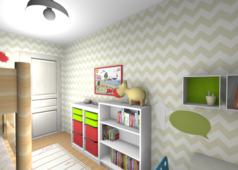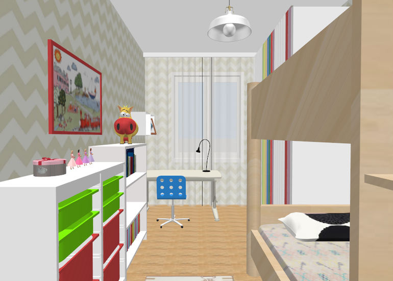 Не понравилсь.Стол, кмк угловой+верхние полки, коли мальчик школьник.Шкаф, учитывая размер комнаты -- угловой.Кровать у двери, спать не удобно, лесенка стоит так, что при открытии двери ребенка можно ударить, я бы переставила к окну.Стеллаж с открытыми полками заменила бы.