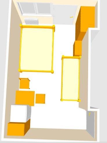Вариант 1:Диван 1600*850, кровать 1600*900, стол 900*600, шкаф 500*1200,шкаф 600*1000, комод 400*900.