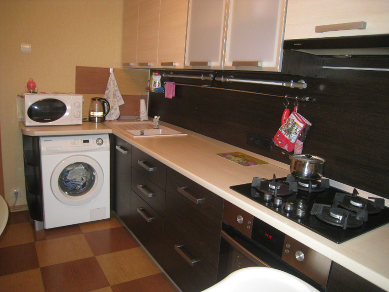 А если без добавления другого цвета, то молочные однотонные шторы и светлый коврик и постер на стену возле стола, часы над стиралкой. Можно просто переклеить обои, таким образом добавить цвет и к ним однотонные светлые шторы