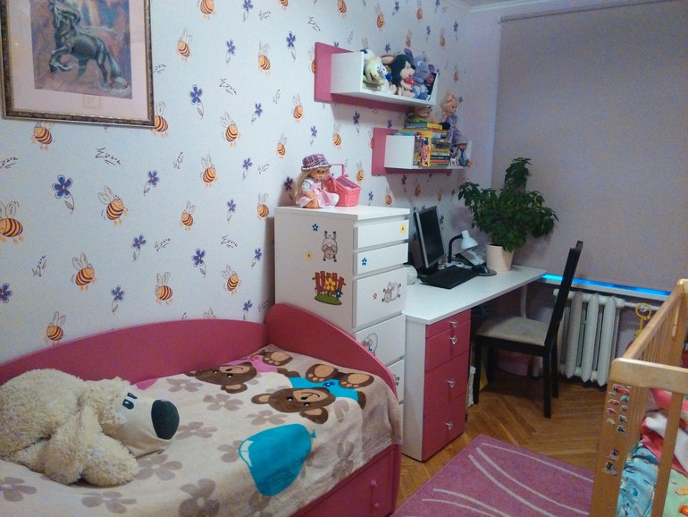 Пожалуйста))Да мне не трудно — это мы с радостью))Так комп сейчас уже и уберите — где дочка у вас рисует-клеит-лепит?..Согласна, с окна может дуть — так кровать будет не прямо у окна, а за вашим комодом..Плюс — повесьте плотные шторы, рулонка хорошо,но шторы обрамляют окно, с ними уютнее( можно и в цвет пчелок на обоях, чтоб разбавить розовое)) к тому же, задвигая их на ночь, вы закроете "сквозняки" от окна и "жару" от батареи..Если дочка правша, то при таком положении стола свет от окна не спасет — нужна лампа))Ногами к двери нельзя — слышали про фэн-шуй?))..да и с практической точки зрения, кровать у двери =беспокойный сон малыша — дочка пошла ночью в туалет, вы заглянули в полночь проверить детей — а двери скрип-скрип,свет с коридора блим-блим))