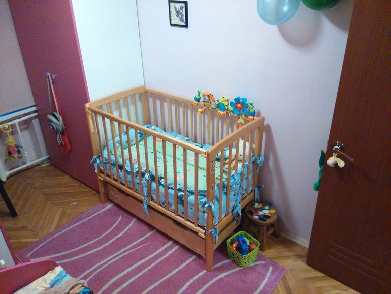 Может Вам поставить к окну за место шкафа комод этот, потом кроватку, а потом уже шкаф? Просто комнатка маленькая, и мне кажется, этот шкаф съедает визуально еще больше пространство.