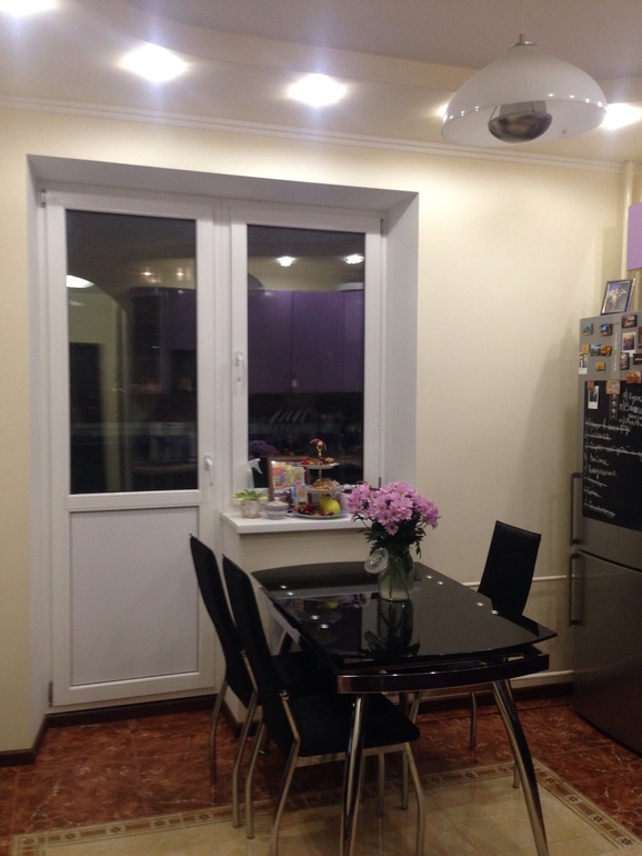 Я бы купила тюль прозрачную светлую с набивным плотным рисунком фиолетовым. С виду вроде и легкие,а вроде и тяжелые. Знаете такие с бархатным рисунком есть. Карниз под металл, на красивых кронштейнах с витыми заглушками во всю стену. У холодильника край на уровне стола,перекинуть через карниз и крупными витками намотать на карниз до другой стены,опустить хвост до пола,закрыв дверь. Хвосты не просто висят,а узлом завязанные. Чтоб смотрелись пошире,а не сосисками с узлами,сверху закрепить булавками. Надеюсь доступно описала свое видение)))))))))