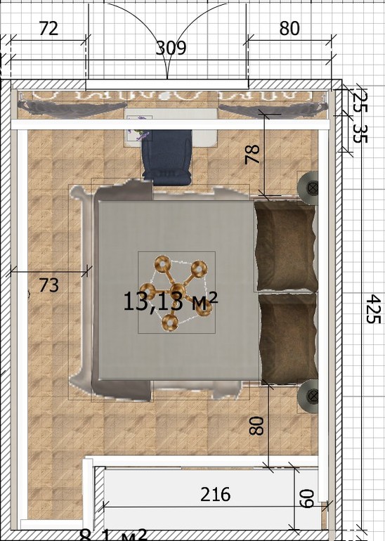 там очень мало места. 77 см от кровати до стены, отними на шторы. Поэтому идеалього варианта здесь нет. Стол скорее будет у стены стоять, но так не очень симпатично. Не хотела портить картинку. И банкетку люди не захотели.Я бы сделала у себя так)