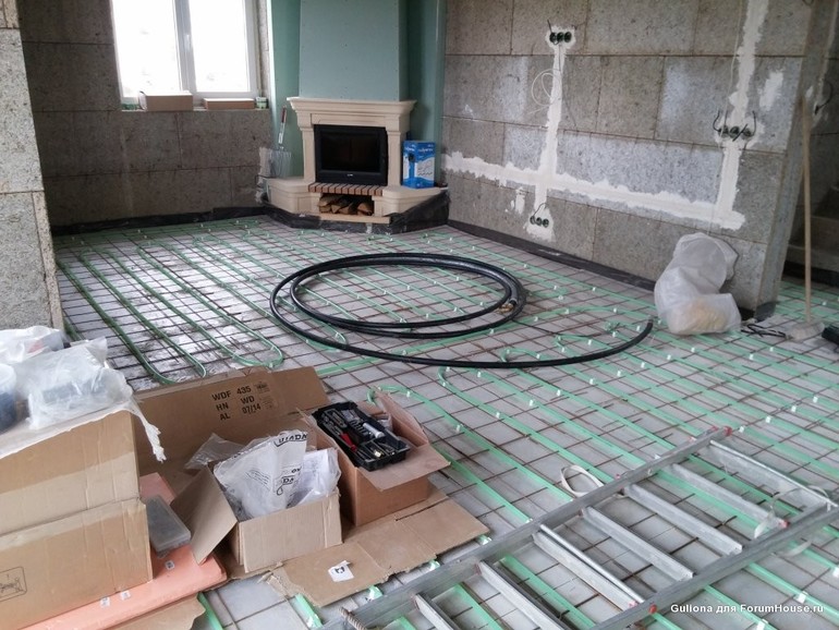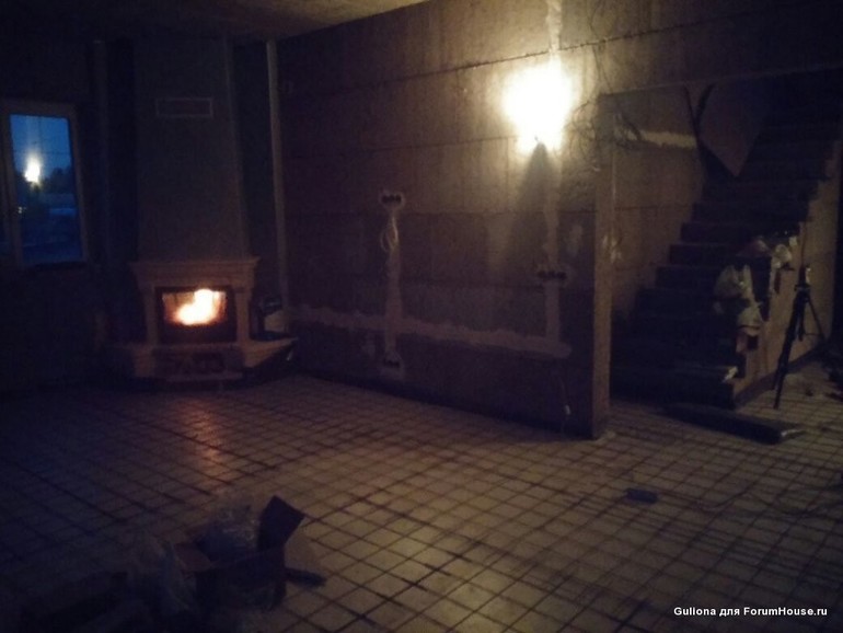 Получилась ступенька 10 см вроде. Хочу ее обыграть справа от камина. Слева уже зашили как есть, со ступенькой.