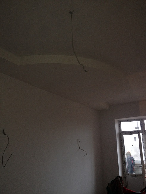 3. Спальня (обоями с цветами будет выложена за кроватью стена в рамке из молдингов и потолок в полукруге, остальное - однотонными) две люстры и два бра