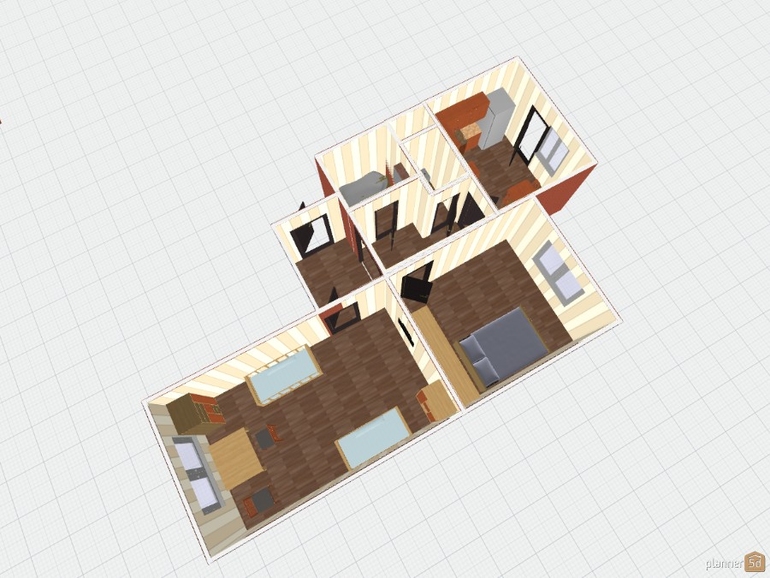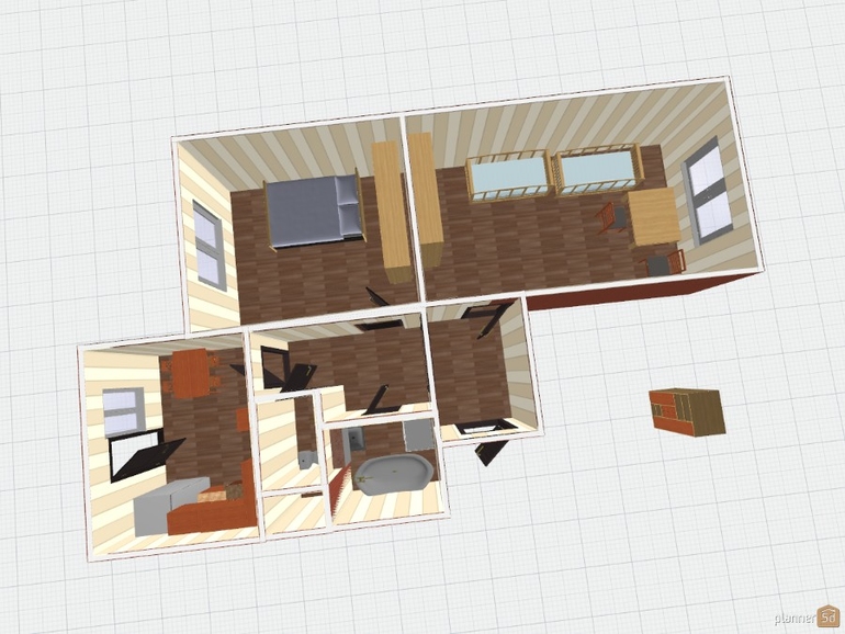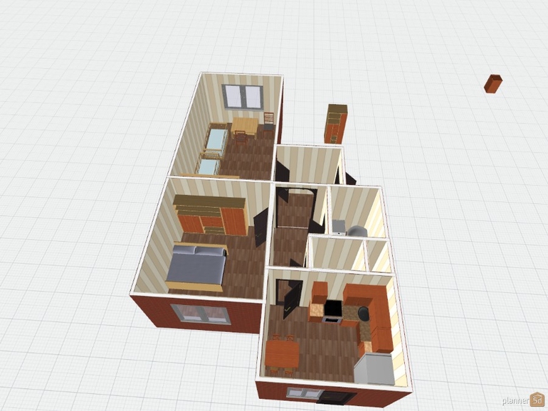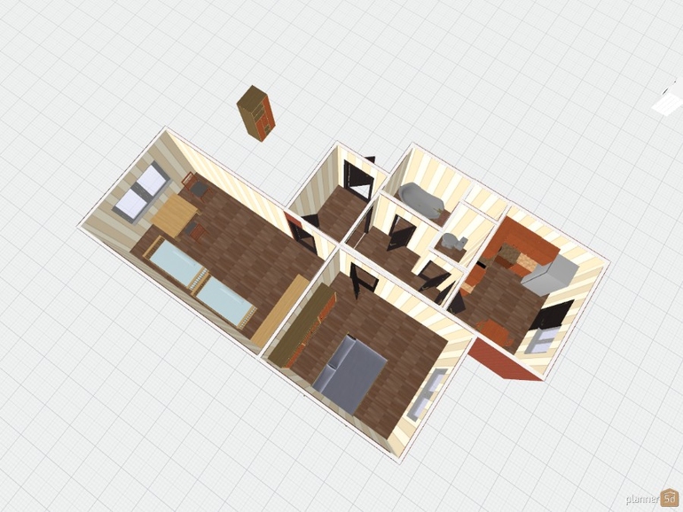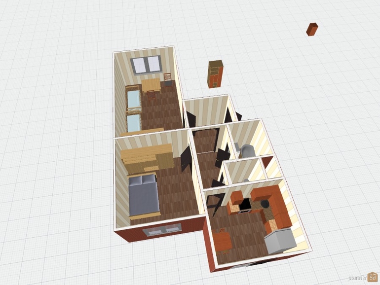 У меня не получилось повернуть некоторые вещи интерьера, поэтому кровать в спальне смотрит вбок, а на кухне мебель вкривь и вкось.