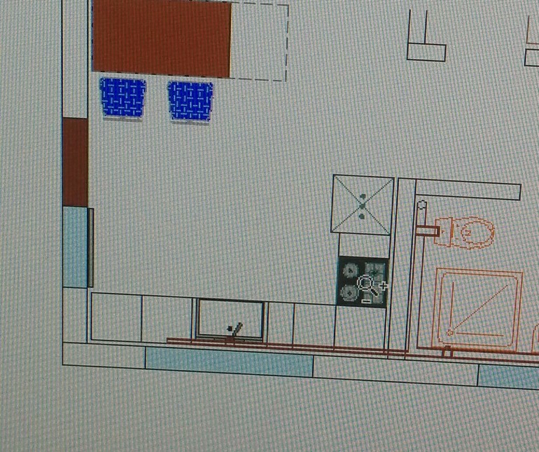 Вариант1: холодильник лучше перенести на противоположную сторону кухни в угол. А кухню можно сделать двухуровневую, на низком уровне раковину делать не рекомендуется, а вот плиту можно. Даже наоборот, легче если плита ниже. Я своим клиентам часто так делаю. А ту сторону где у вас сейчас плита, нужно под рабочу зону оставить, а раковину я бы в угол поставила. Вариант 2: Плита под окно как в первом варианте, а раковина справа от плиты, но шафчик под раковину поваше сделать. остальное можно оставить. Если плита под окном, то вытяжка нужна специальная, которая встраивается в шкафу внизу, а не в навесных. У нас такая down draft называется. Ну или совсем по другому планировать. Кухню по левой стене пустить а справа стол поставить.