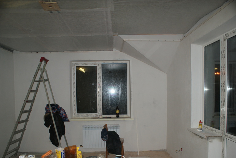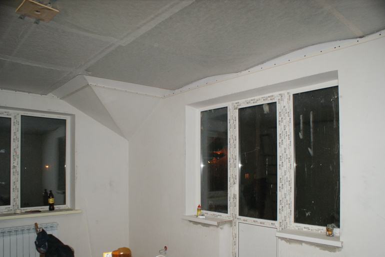 Оно в итоге не будет выглядывающим, мы наверное сделаем одно полотно как мне изобразили, а для прозрачной шторы продолжим карниз по скосу. Римские мне по стилю не подойдут