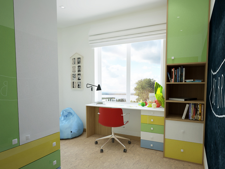 На этапе проектирования детской мы с заказчиком решили выбрать цветовые акценты оттенков лета и природы - солнечный желтый, сочный зеленый, ягодный красный и небесно-голубой. Несмотря на, казалось бы, обилие цветов, комната выглядит очень воздушной, легкой и светлой.