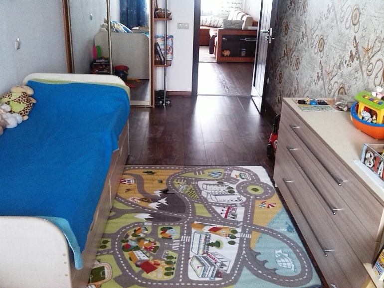 Шкаф мы перевезли с собой из нашей прошлой квартиры, он был встроенный и угловой большой, но мы решили сделать его небольшим и прямым, т.к. не занимать ведь ребенку всю комнату одним шкафом, и такого хватает, тем более, что в прихожей большой шкаф-купе еще один. А этот шкаф муж сам переделал.