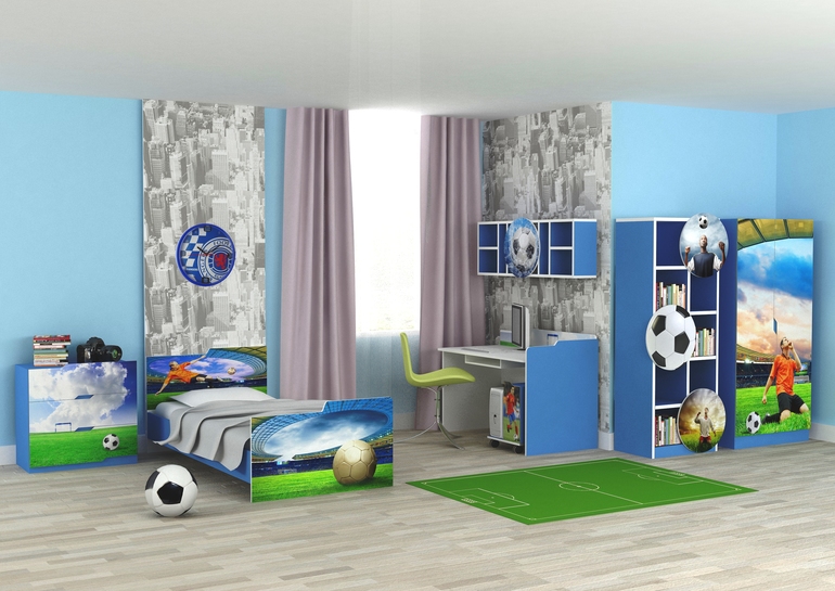 Если вы делаете ремонт, то лучше обои подобрать в тематике, с мячами-кубками, мебель сама по себе набор красивых картинок.
