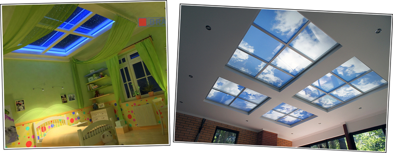 Пока гуглила картинки фальш окна на глухой стене, наткнулась и на такие вещи: декоративные окошки (понятно, тоже не очень настоящие) на потолке с эффектом стеклянной крыши.