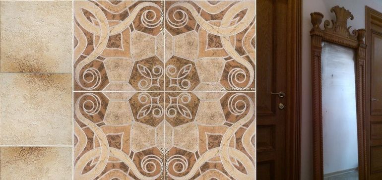 Средняя плитка — которая с ковровым рисунком, на картинке как будто бы из одной коллекции с плиткой слева (однотонной). Цвет двери из одной цветовой гаммы, что и рисунок на ковровой плитке.Всё подходит.