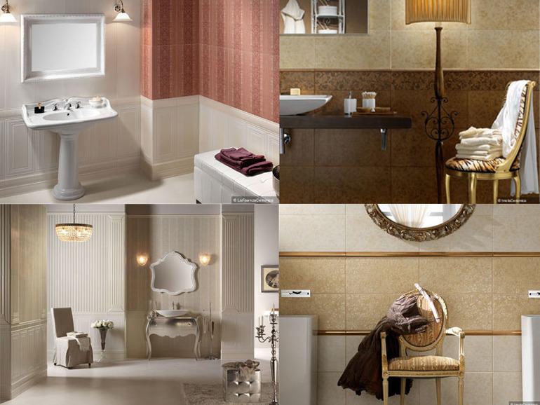 Можно выбрать на пол плитку под дерево, камень, а на стены подыскать варианты с эффектом старины, можно попробовать декор из мелкого цветочка или ту же плитку, имитирующую текстиль.