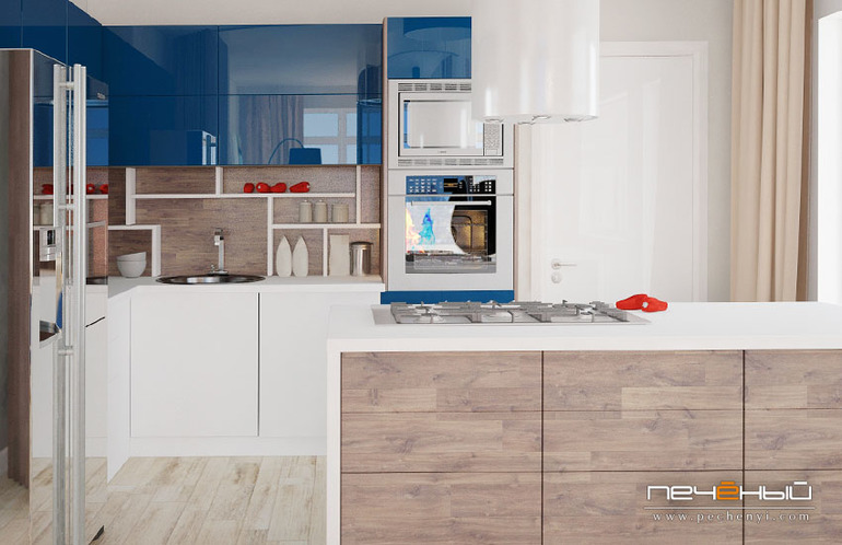 Казалось бы: в таком доме можно сделать царскую кухню для хозяюшек! Однако заказчица сразу пояснила, что большая кухня ей ни к чему, поскольку она практически не готовит. Остановились на таком варианте: островок с варочной поверхностью и скрытыми ящиками для хранения, небольшим количеством шкафчиков и зеркальном холодильнике, который, как и камин, заказчица выбирала сама. Небольшая дверь, которая видна на картинке, ведёт в помещение-прачечную, а следом - в комнату горничной.