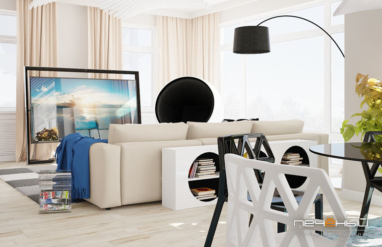 Между окнами заказчица хотела разместить телевизор, однако расстояние на стене там достаточно маленькое, поэтому она остановила выбор на такой вот напольной модели, которая выглядит, как футуристичный музейный экспонат. :) Кресло шар, знакомое вам по прошлым проектам, удачно вписалось в этот интерьер, ему в поддержку - стеллажик, маскирующий диванную спинку.