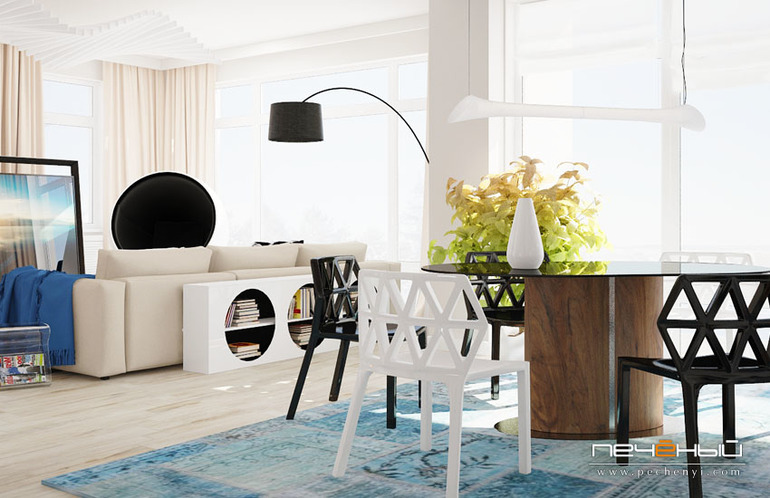Полы в помещении тёплые, из керамокранита под дерево. Зона столовой выделена подвесным светильником и ковром, что, скорее, редкость - многие хозяйки сходятся во мнении, что это не слишком практично с точки зрения уборки. Однако в заданных условиях ковёр смотрится замечательно, подчёркивая изящные дизайнерские стулья и стол.