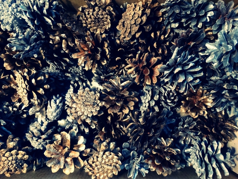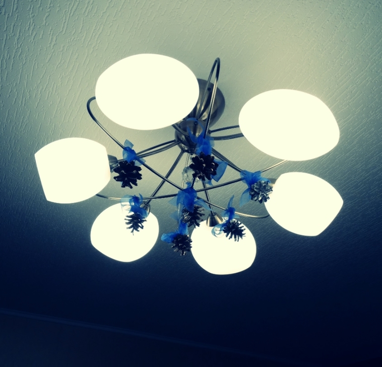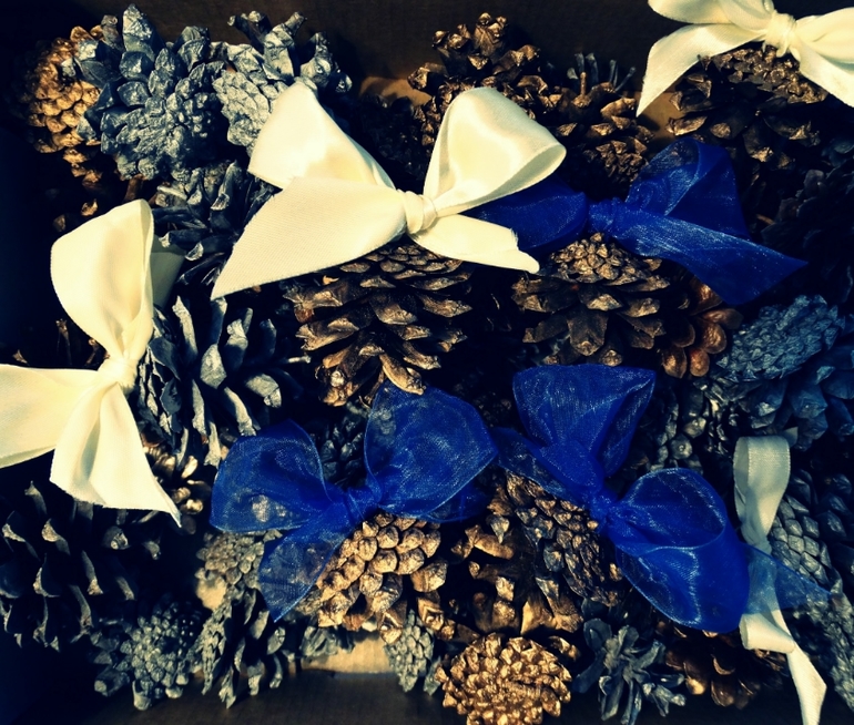 Шишки(на ёлке)-ручная работа!Делали вместе с мужем...насобирали шишки в лесу,подождали пока они высохнут,покрыли лаком и украсили бантиками!Для покраски выбрали стандартные цвета-серебро и золото!