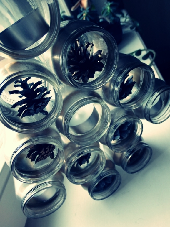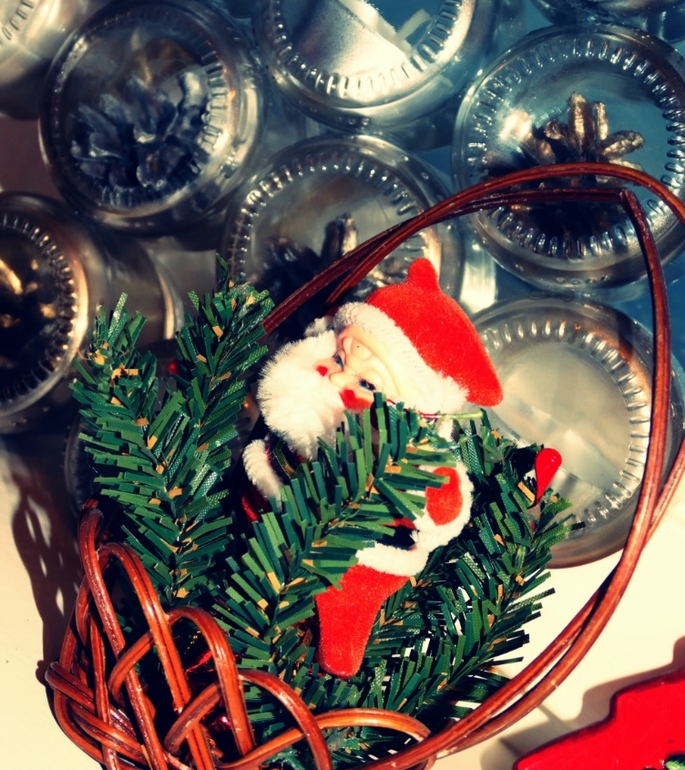 Второй нашей поделкой hand made стала ёлочка!В основе которой лежат баночки из под детского питания)Я - Плюшкин,жалко многое выбрасывать,вот и насобирала!Муж вошёл во вкус(идея ему понравилась)...сидел и всё клеил,потом покрывал лаком....внутренности заполнены шишками и свечами!