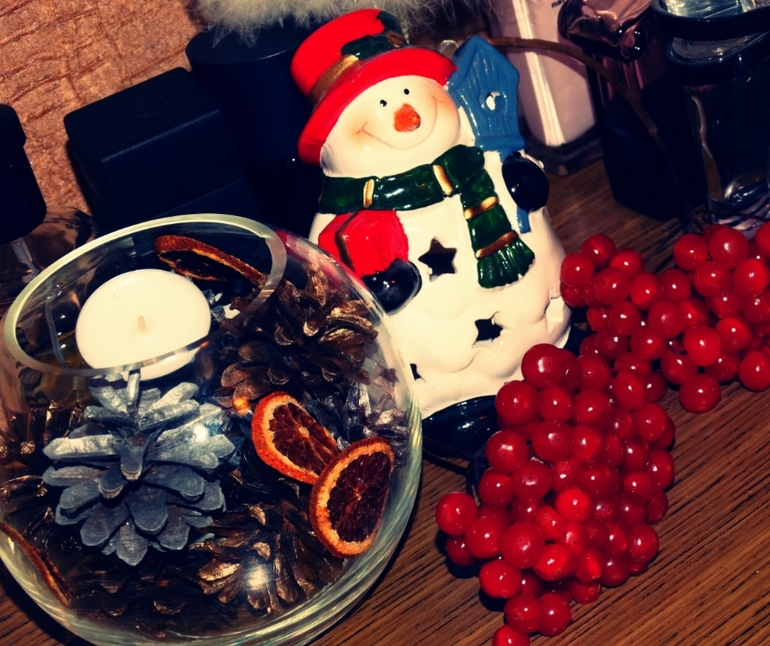 А комод украсили вазой с шишками,высушенными мандаринами,свечами и веточками калины) Ну и снеговиком)