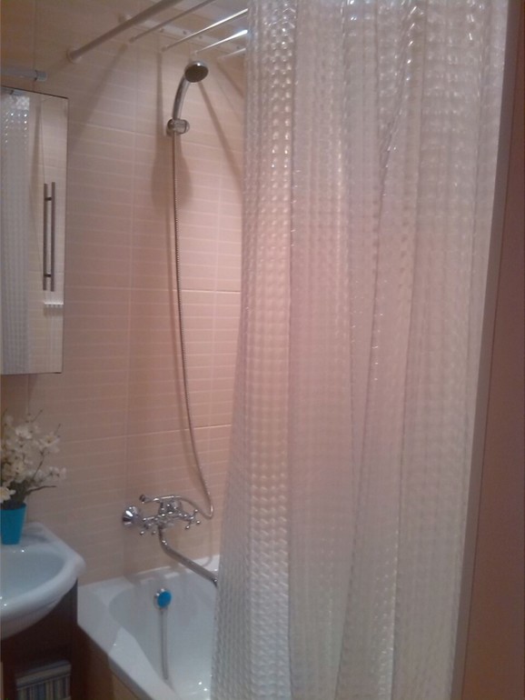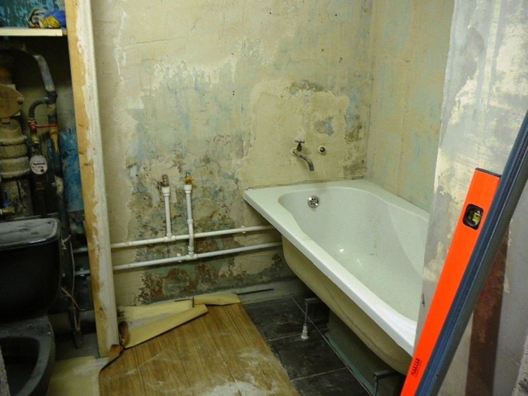 Ванна здесь уже новая стоит (акриловая), слева был умывальник, трубы уже заменили на новые. Вообще весь ремонт делали сами (муж, и наши с ним папы), даже в ванной, вызывали только слесаря переварить змеевик, и плиточников нанимали. А стены строили сами, и ровняли тоже, плитка ведь у нас не везде.