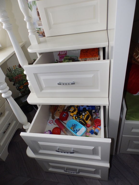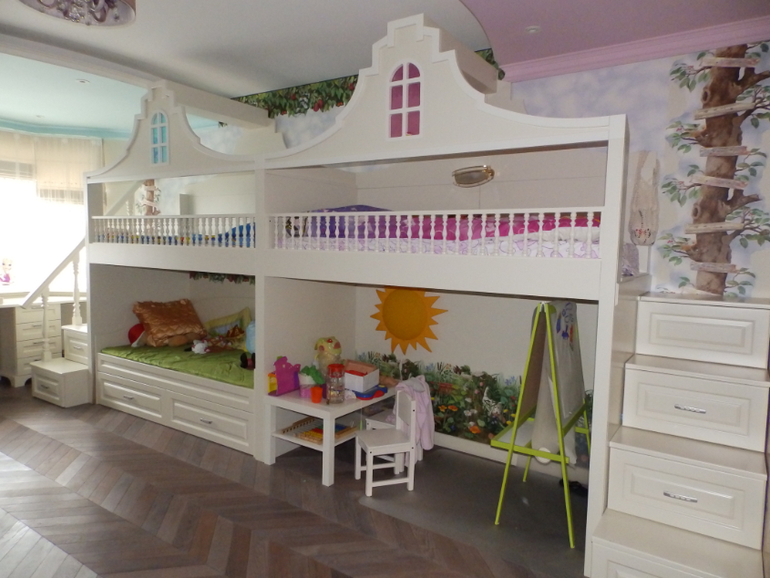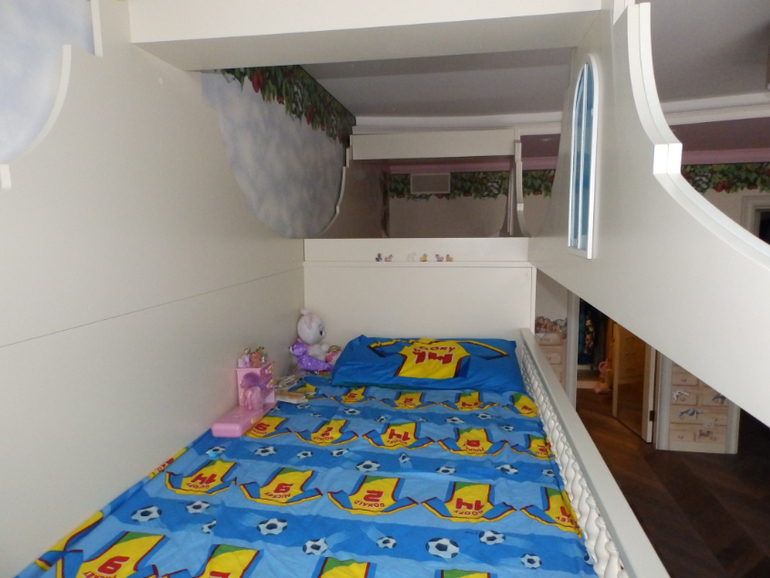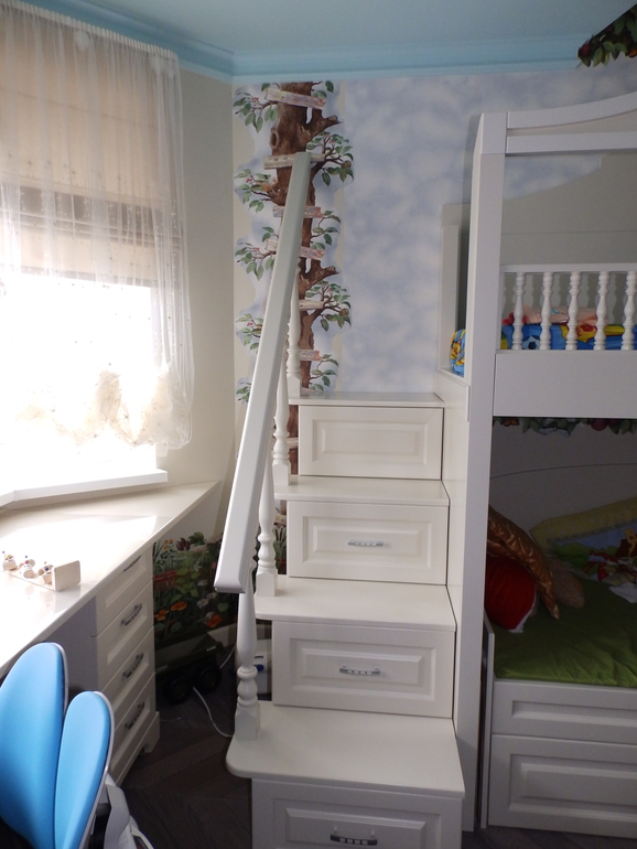 отдельно хочу показать мебель детской! улетная кровать!))))) сделана на заказ, МДФ, с цветными стеклами -вставками. столы и книжный шкаф в комплекте.