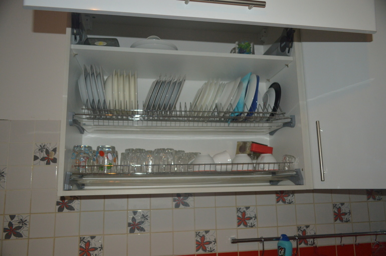 Следующая секция посудомойка внизу и сверху сушка. Про ПММ отдельно, а вот сушку покажу сейчас. Довольная ею безумно. Сверху полочка для запасных чашек, гостевых. Внизу на решётке сушатся чашки, стаканчики, рюмочки, стаканчики. На столешке над ПММ стоят чайники- заварные и керамический электрический, подставка под горячее и подставка под ложки для готовки. 60 см поверхности достаточно, чтоб работать с ней с разделочной доской, блендером, что-то порезать, замесить.