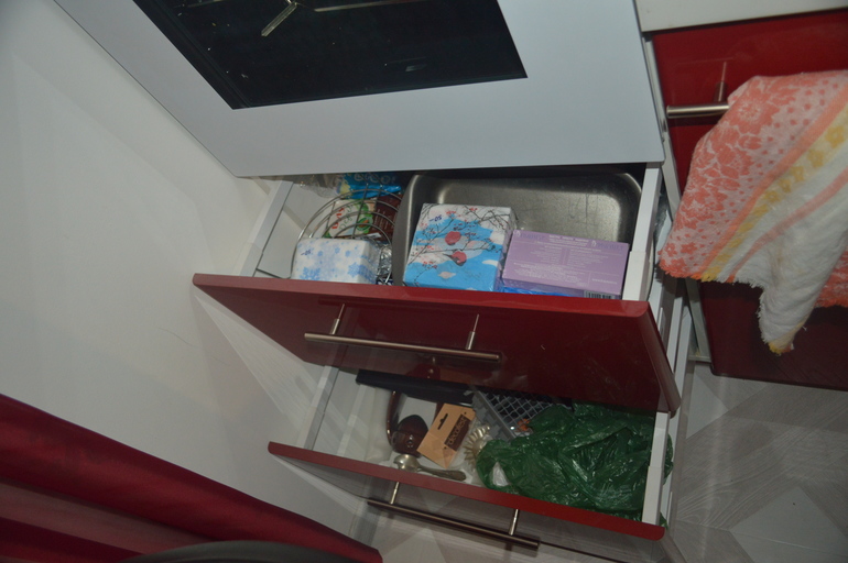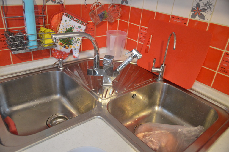 Под раковиной стоит мусорное ведро, храняться фейри бутылка для доливки в дозатор, бумажные полотенца, фильтр к ПММ, фильтр питьевой воды, ёмкость для хранения отфильтрованной воды на 12 литров. Миска временно, проверяем не течёт ли новый шланг))))