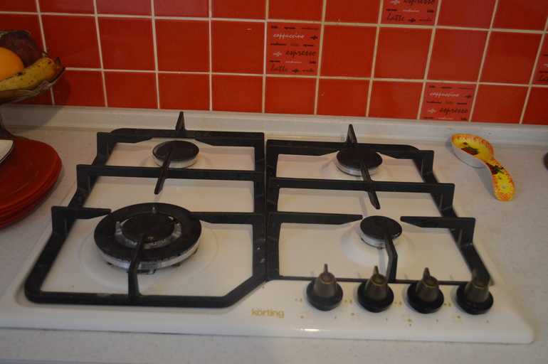 Далее варка. С варкой у нас отдельная тема. Ту что я купила, не прошла по размерам. В итоге мы были немного зависимы от всраиваемых размеров и взяли вдвое дороже Кортинг. Она немножко бежеватая, можно сказать молочная. Но я ею довольна. С газ-контролем, отличная по размеру, хорошие комфорки, все нужные. Двойной короной в основном не пользуюсь, но иногда нужна и не подводит.