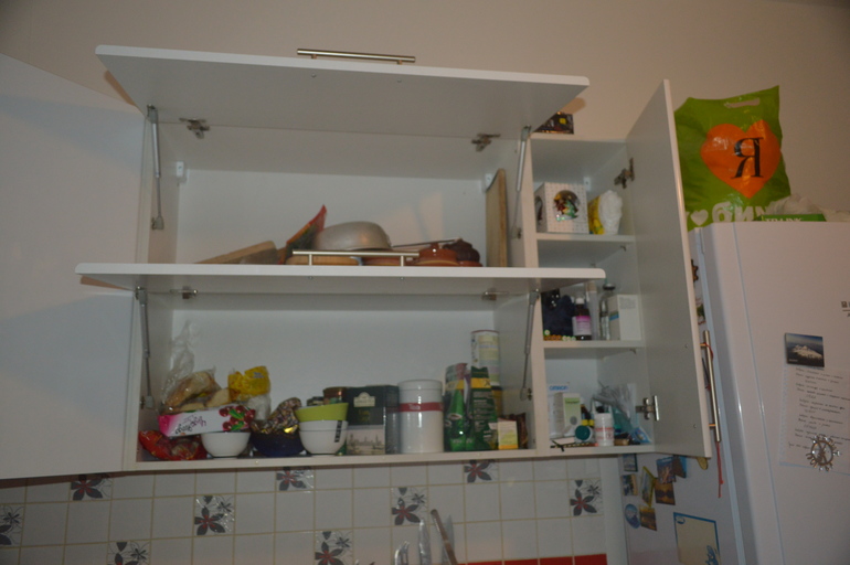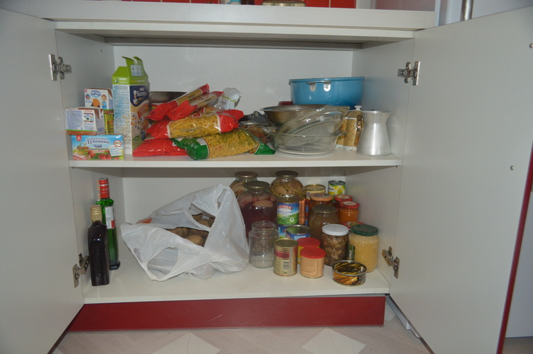 Далее рабочий стол, целых 90 см. Отличная рабочая поверхность, внизу большой отличный шкаф для хранения, сверху две полки- одна для чая-сладостей, вторая хранить доски, горшочки и прочее. И сбоку довершает шкафчик-аптечка.