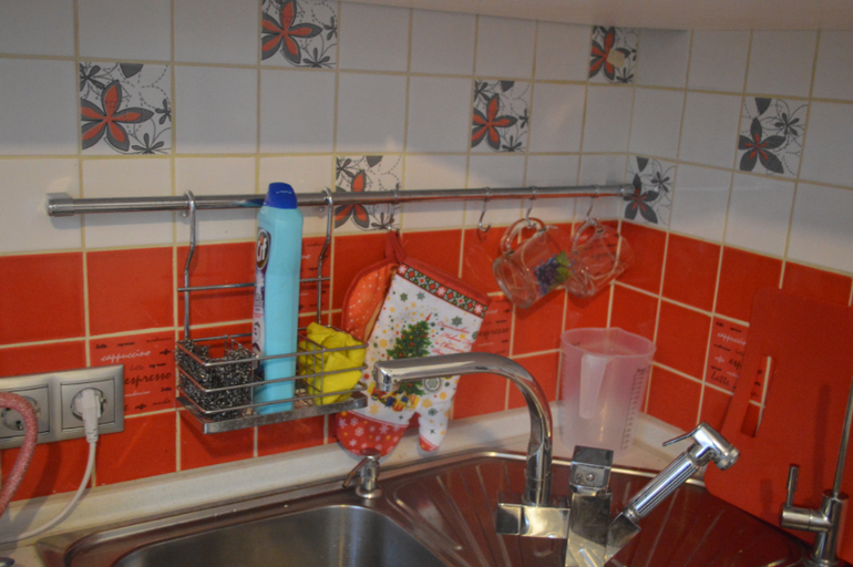Над раковиной рейлинг- стойка для тряпочки и чистящего, далее крючок для прихваток и три крючка для наших чашек- моей, мужа и сына))))