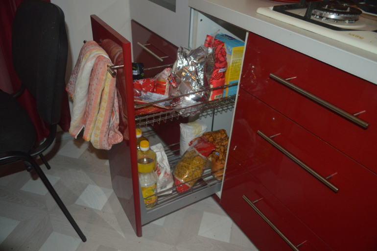 Начнём от колонны. Верхний ящик фото показывать не буду, там лежит мои мелочи для свече и мыловарения) Далее полочка для СВЧ, пока там стоит и внизу ящик под хознужды - там храняться всякие формы для духовки, мусорные пакеты, пакетики, свечи запасные, шпажки и прочая мелочь. Очень удобно, что они выкатные.