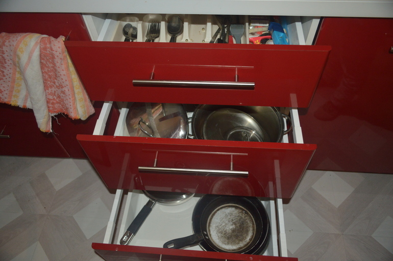 Далее варочная поверхность. Над ней будет вытяжка, а под ней ящики. Выкатные, что очень удобно. В верхнем всякие ложки-вилки, далее кастрюли (у меня их штук 8-9, все уместились), далее сковородки (от маленьких до вог). Очень удобно и всё влезло.