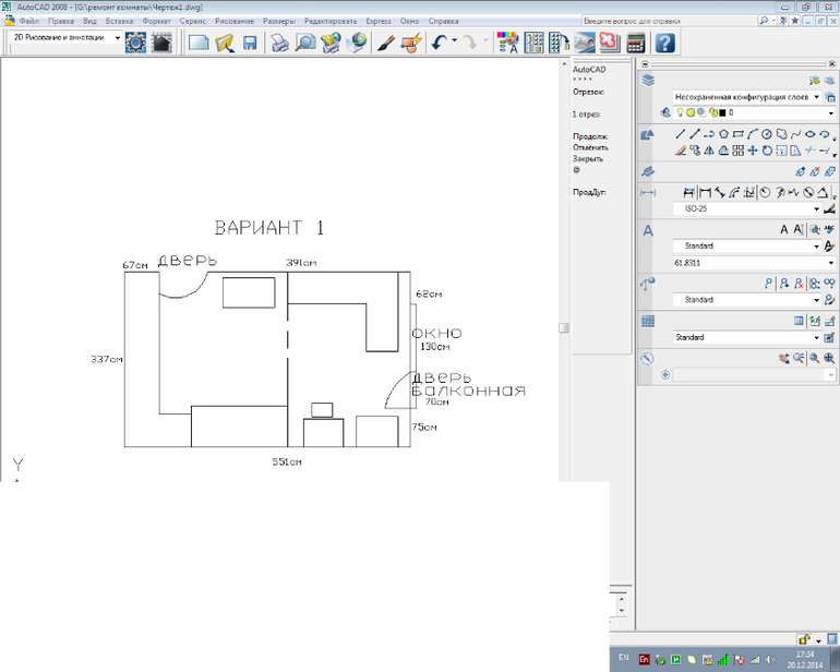 И так по плану у меня во всех вариантах слева по короткой стороне шкаф-купе угловой или встроенный.В нижнем левом углу за балконной дверью шкаф с книгами.