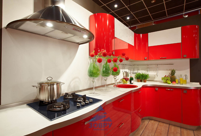 Можно голубой взять немного бледнее, чем на фотоОстальное все (мебель, текстиль) я бы в этом случае делала белым.Что касается материалов для отделки стен. Если стены не очень ровные, то можно купить плотные обои под покраску (плотность не менее 120 гр на м2), лучше даже не гладкие, а с небольшим ненавязчивым рельефом и покрасить из МОЮЩЕЙСЯ краской, на которой написано "для кухонь и ванных комнат". Это позволит сэкономить на идеальном выравнивании стен. разумеется. сильную кривизну все равно придется ровнять, иначе и мебель не встанет нормально.декоративная штукатурка — тоже хороший вариант, но я не уверена, что это получится дешевле, чем красить.фартук я бы на вашем месте делала однотонный белый или под цвет стен, если склонитесь к бежевому варианту. Не поддавайтесь искушению сделать скиналь с каким-нибудь фото красных маков. Будет просто кухня-вырви глаз. Помните — никаких крупных объектов красного цвета добавлять нельзя. К такому современному стилю кухни хорошо пойдет крупноформатный керамогранит 60х60 см — то есть одна плитка пойдет на всю высоту фартука. Если для вас это слишком экстравагантно, то остановитесь на мелких квадратиках 10х10 см, также чисто белого цвета или еще лучше белой мозаике, если бюджет позволит. У Керама Марацци есть относительно недорогая мозаика в серии Темари, посмотрите, она интересно смотрится за счет рельефности.