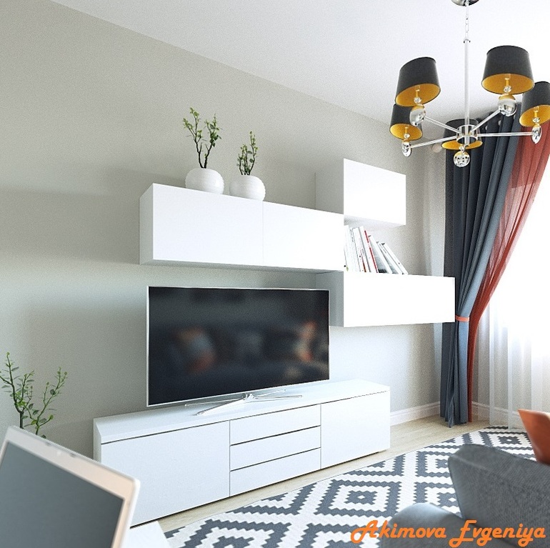 Гостиная - средних размеров для однушки, но не позволяет комфортно расположить и диван, и кровать, поэтому решено оставить раскладной диван. Плюс небольшой столик и встроенный шкаф-купе.