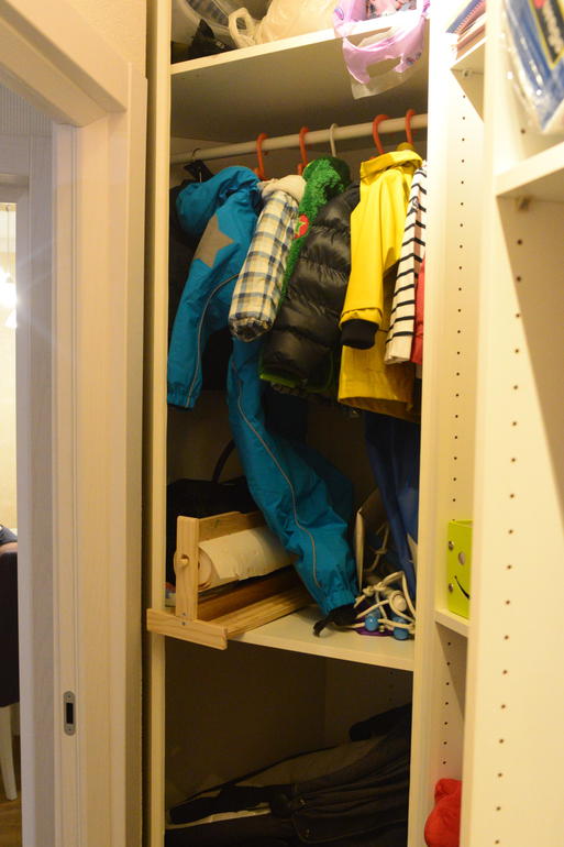 Несколько раз брали сомнения делать ли шкаф-купе или гардеробную, но очень рада, что муж не повелся на мои "шкаф купе внешне меньше места занимает" и всё-таки стену поставили. Т.к.добавился лишний угол в комнате и на одном из фото видно, что удобно положить что-то объёмное, в нашем случае немного торчащие коляски.