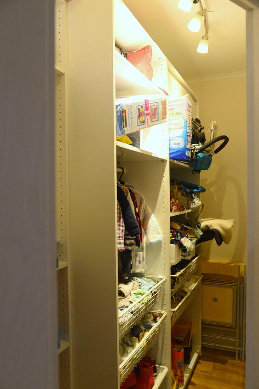 Получилась она не такая уж и небольшая. Шкафы Паксы везде 75+100+50+угол, свободного места конечно ещё много, но сейчас зато туда влезло две коляски и люлька, автокресло с исофиксом, конверты, ну и куча одежды и игрушек. Думаю, что такого объёма хватит на долго.