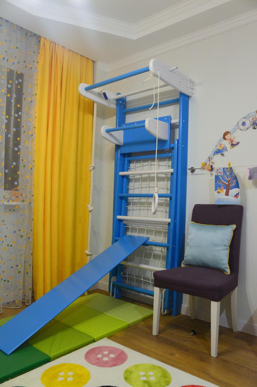 Наша стеночка. Фирма Ирель, заказывали на ББ. Цвет можно выбрать любой, у нас такой получился. Сначала была в шоке от него, а теперь даже нравится. Мат тоже из икеи, удобно хорошо складывается. У нас сынок не очень активный пока, пользуемся в основном горкой, сам с неё катается и машинки, мячики запускает. Тут же видно, как ковёр к нам вписался под тюль и объединил в себе все цвета с комнаты.