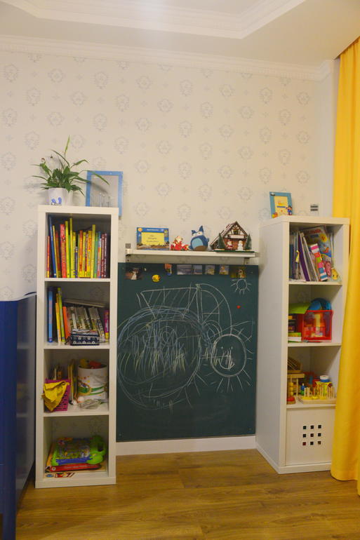 Наши стеллажи и магнитно-меловая доска. Идея полностью взята у одной из творческих мамочек на ББ, ссылки уже к сожалению не осталось, но думаю многие узнают. Размер доски 90х120 вроде, покрасили сначала магнитной краской, потом грифельной. Красили дсп, не стену, и потом на саморезы к стене. Размер мне кажется минимальным, меньше точно не надо, только если больше. Одному хорошо, двоим детям не плохо, а со взсрослым совсем тесно.