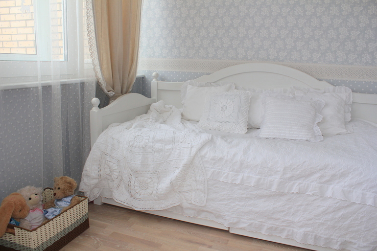 Комната около 9 метров с присоединенной лоджией. Пол - паркетная доска, обои шведские borastapeter vintage. Мебель встроенная на заказ, кровать и стол - Бакаут. Сундук икеевский, крашенный и оклеенный осатками обоев)) Занавески Икея, обшитые льняным кружевом, тюль в горошек тоже Икея. Ковер и карандашница - ярмарка мастеров. Тестиль - Зара хоум. Замечательное окошко - Наталья