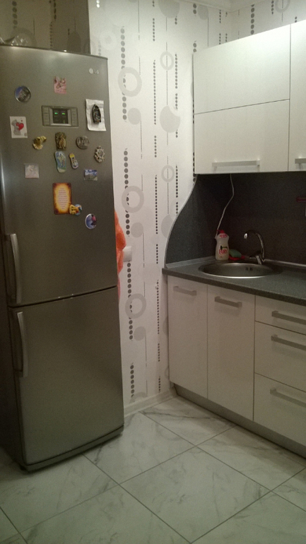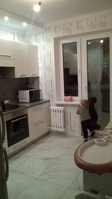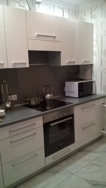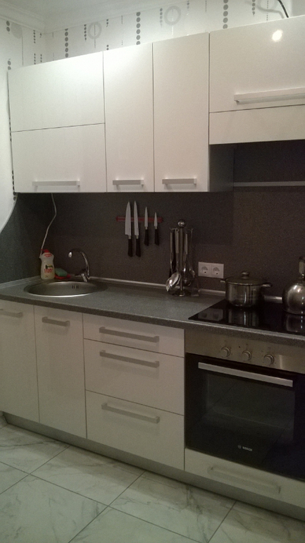 Варочная панель Electrolux, встроенный духовой электро-шкаф Bosch - очень довольна ) Мойку и смеситель на первое время поставили Frap....а так хотим blanko и каменную мойку...Кухня сама из акрилового перламутрового пластика,никакие пальцы не видны)))везде доводчики Blum.Плитка на полу керамогранит от Керамин...плитка матовая,тоже очень мне нравится.Обои Rasch ,клеили сами,вообще без проблем,моются,а в живую как-будто кружочки выпуклые и из ткани....не знаю,как на фото,но они реально расширяют пространство...