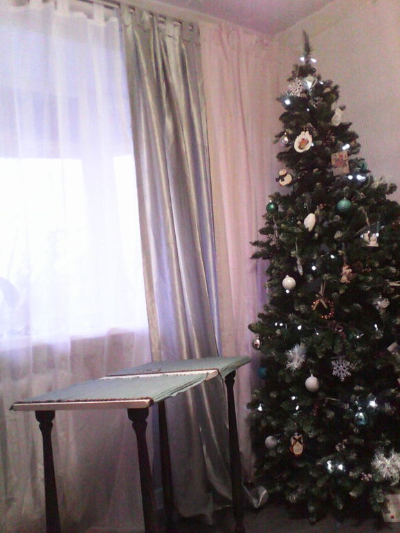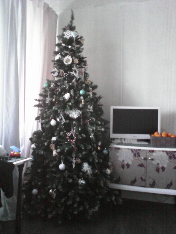 Столик сделан своими руками,тумбочка под ТВ переделана из старой советской. Это моя первая елочка. Купила сразу хорошую высота 210. Могу не много ремонта показать,все сделала сама,придумывала тоже сама. на полу ленолиум,диван у меня чернофиолетовый,выплаканный не хотели его впродавать с витрины,обои в полосочку. Остался только поталок. Вообще у меня угловая однушка переделанная в 2:-) это моя часть