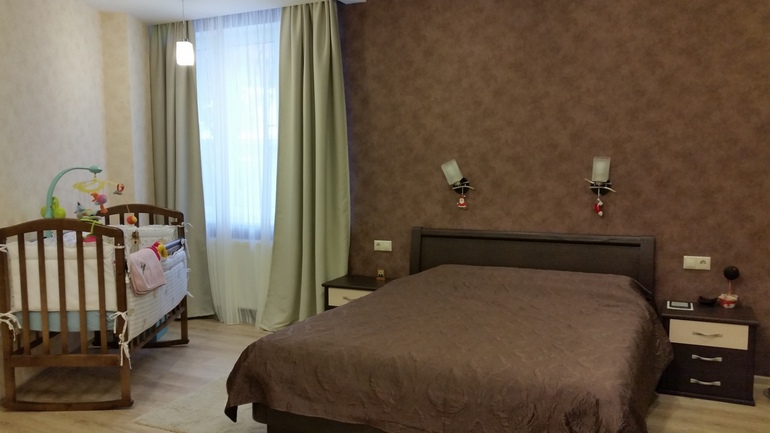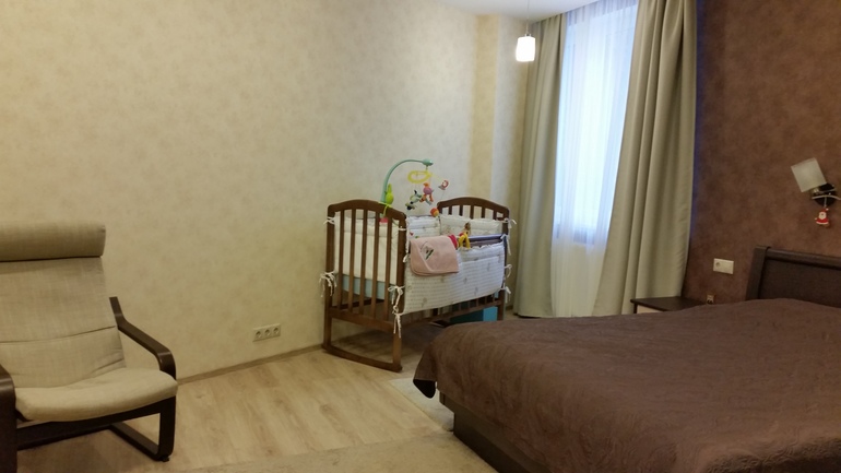 гостиная, она же спальня 28 кв.м. комната нестандартная, с острым углом( там где манеж) и двумя окнами..