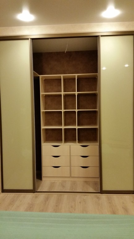 гардероб небольшой получился, но намного вместительней шкафа... правда двери смотрятся зеленоватыми, на образце стекла было по другому(((