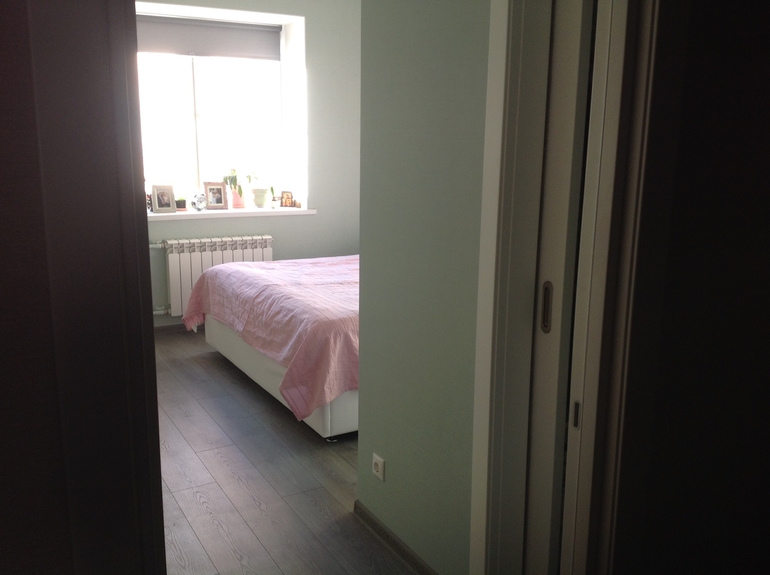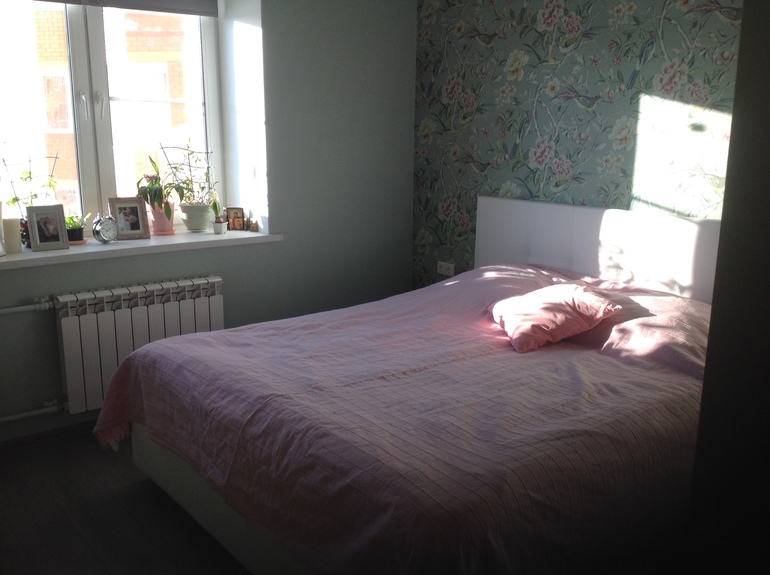 Теперь спальня. Примерно 17 кв. метров. Сделали в ней небольшую гардеробную, на спальню осталось примерно 13 квадратов. Нам этого вполне достаточно. Кровать 180 на 200 встала легко и осталось место для тумбочек, комода и камина, которые тоже (надеюсь скоро) появятся.