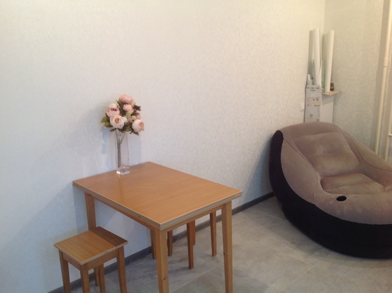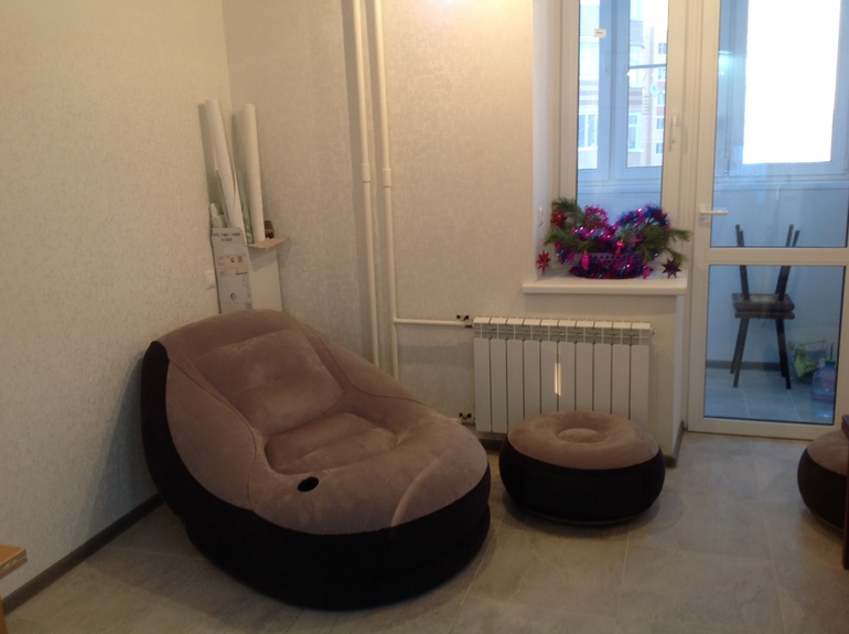 Стол временный, переехал от родителей, вместо дивана в зоне гостиной надувные кресла (ксати безумно удобные)
